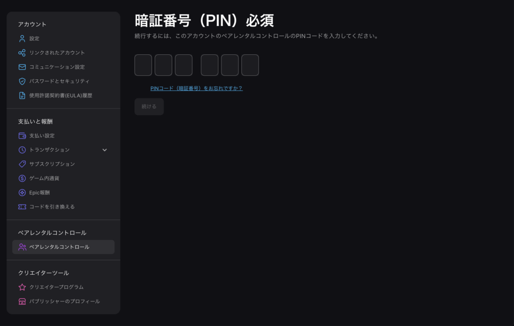 設定すると、子のアカウントにペアレンタルコントロールを設定する際には、画像のようにPINを求められます。これで、子による勝手な設定変更を回避できます。