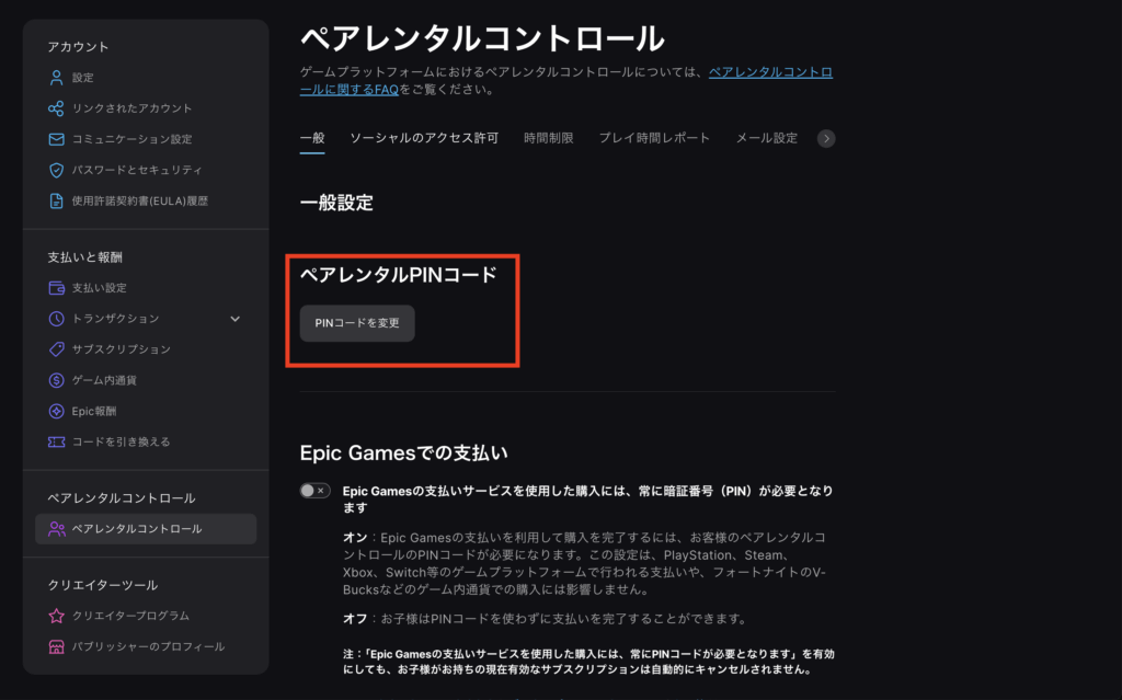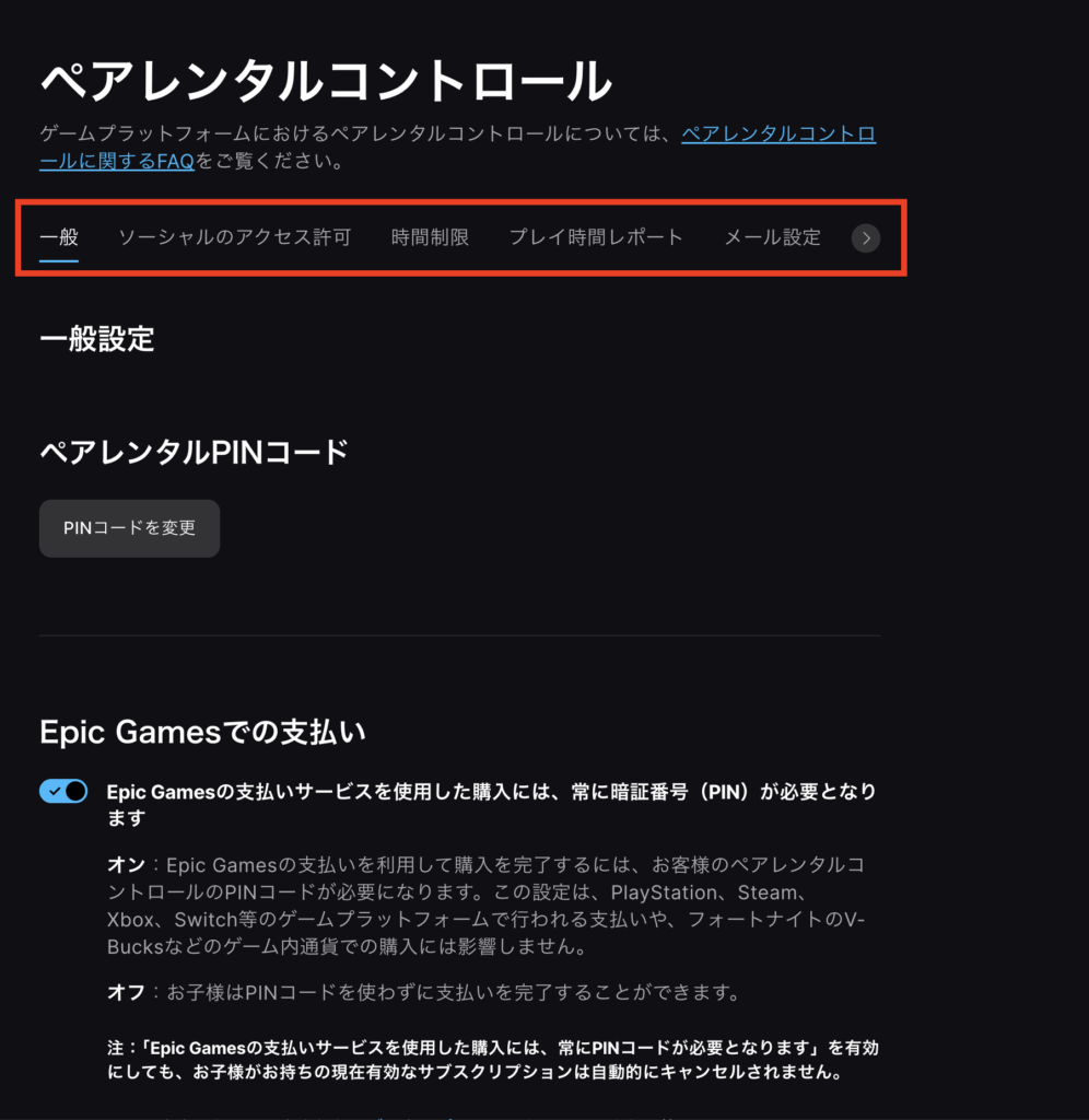 Epic Games自体はゲームプラットフォームで、Fortenite以外にも様々なコンテンツが購入できたりします。不意にFortenite以外のゲーム購入だったりを防げるので、ONにしておくのが良いと思います!