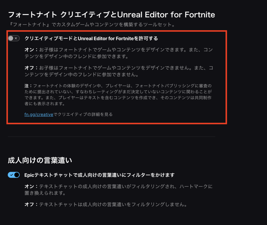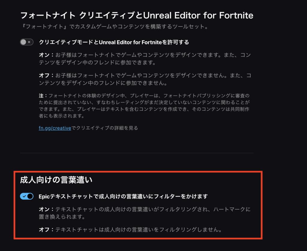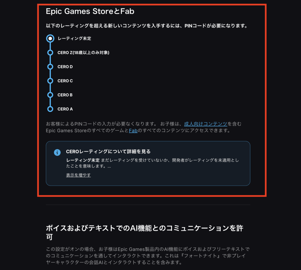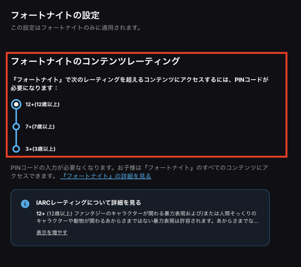 | コンテンツ年齢レーティング | – Forteniteない各コンテンツの年齢制限設定 – 制限以上の体験はPINで解除 – クリエイティブ/UEFNの使用制御 | 「なぜ入れないの?」と聞かれたら“年齢設定が合ってないだけ”と説明できるのが便利。 |