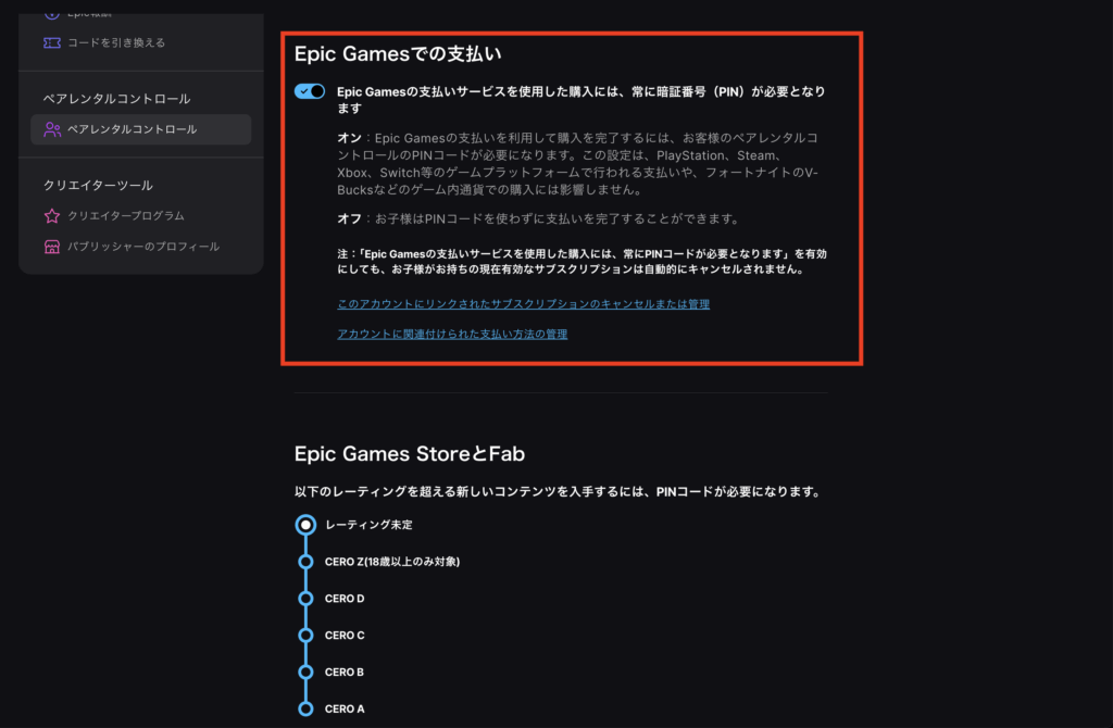 何回もしつこいですがEpic Games自体はゲームプラットフォームで、Fortenite以外にも様々なコンテンツが購入できたりしますので、購入時に設定したレーティング以上のコンテンツの購入をする場合にPINの入力が必須になります。年齢に合わせて、基本ONで良いかと思います!