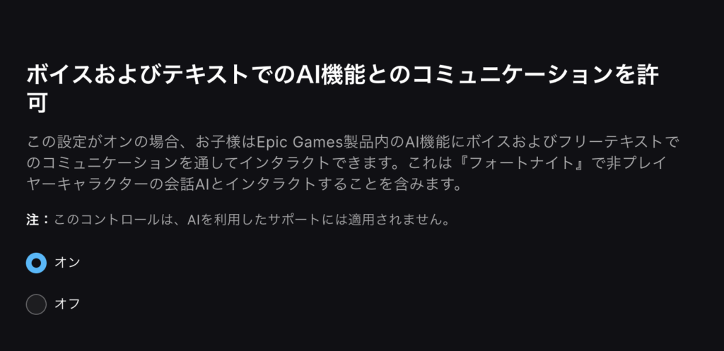 最近っぽい設定ですね。AIのNPC(non player charactor)とのボイスやテキストでのコミュニケーションを許可するかの設定です。これはおうちの方針に合わせて設定でいいと思います!